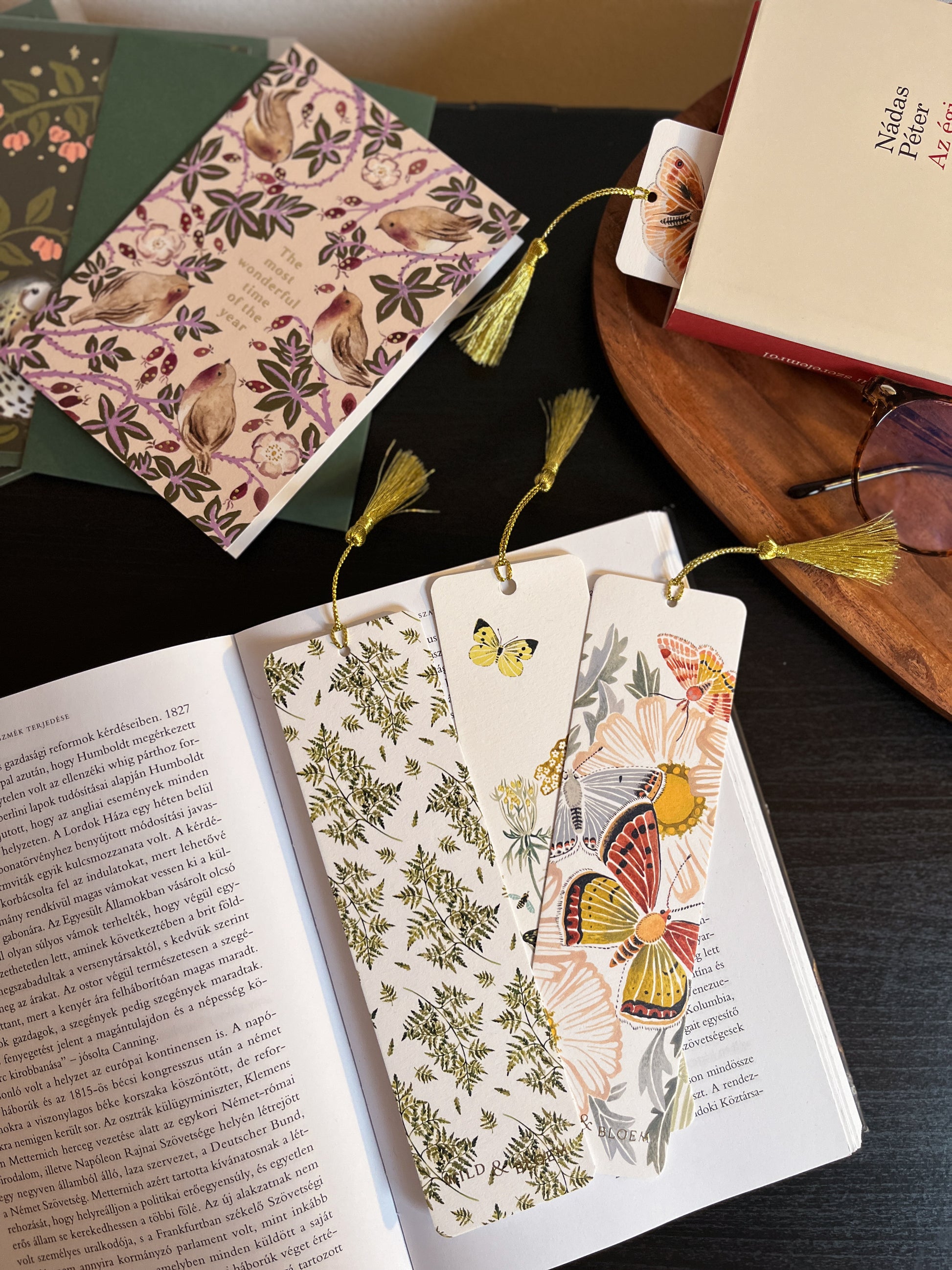 Papír könyvjelző aranyszínű díszrojttal a tetején, páfrány mintával.