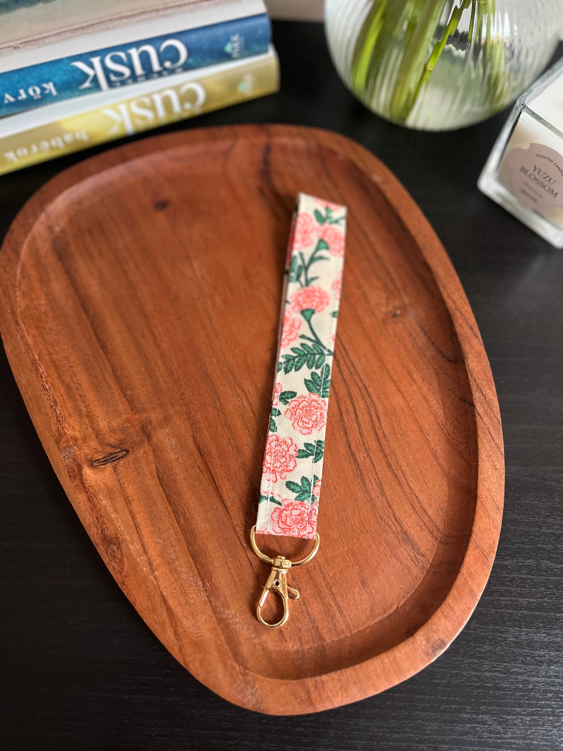 100% pamut, mintás vászon csuklóakasztó fém karabinerrel.