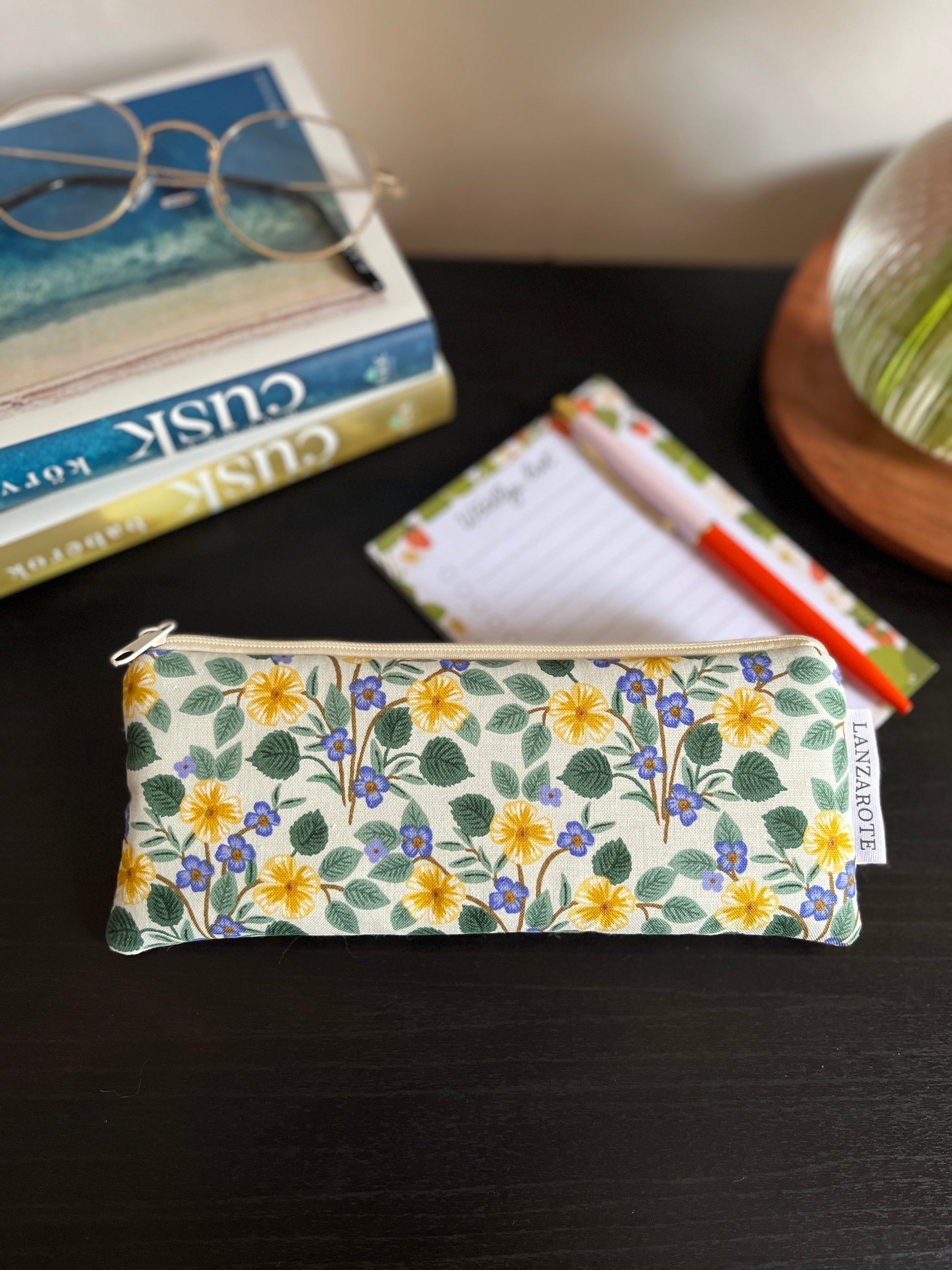 Puha közbéléssel készült cipzáros tolltartó vajsárga pamutvászon béléssel.