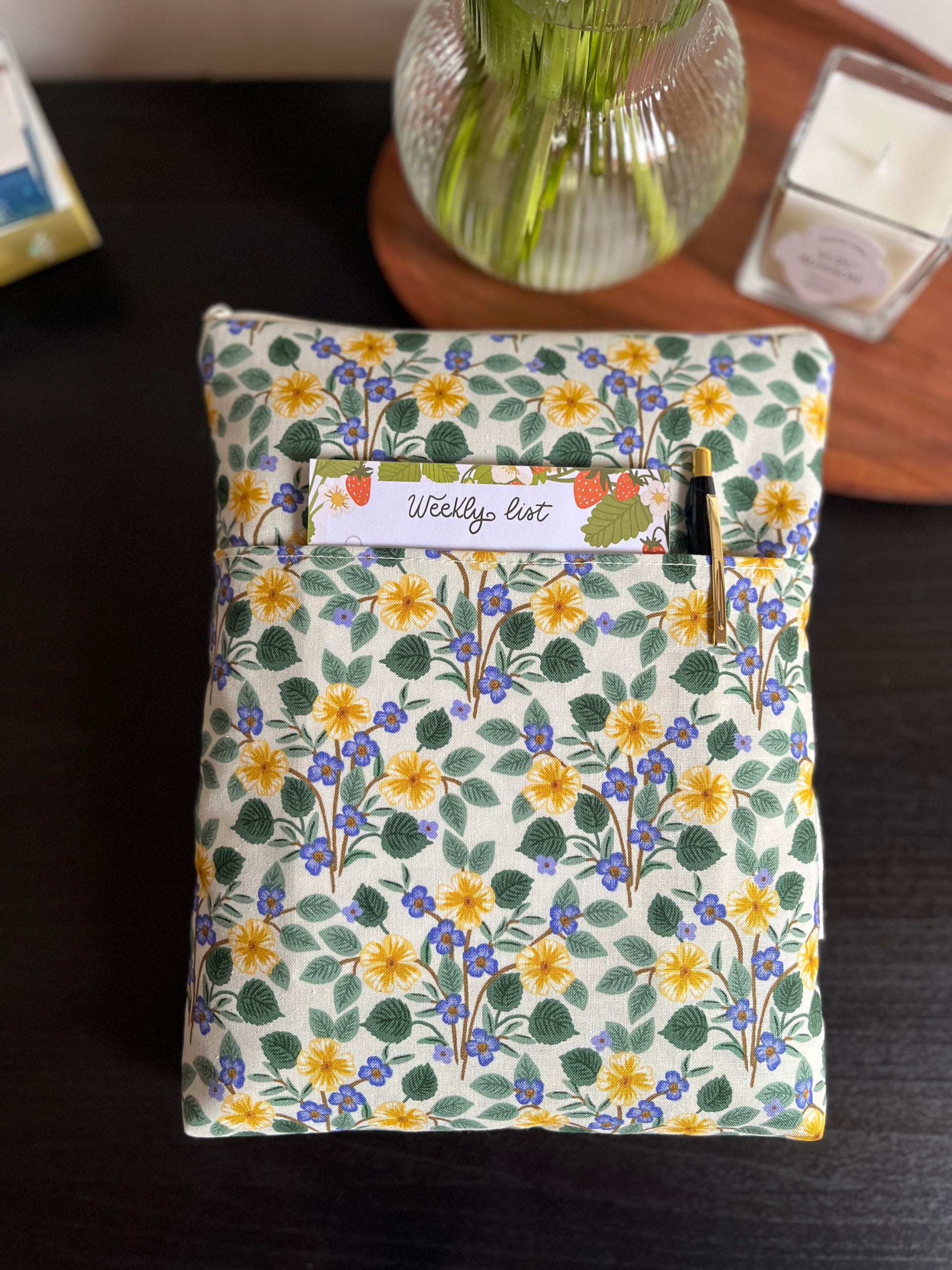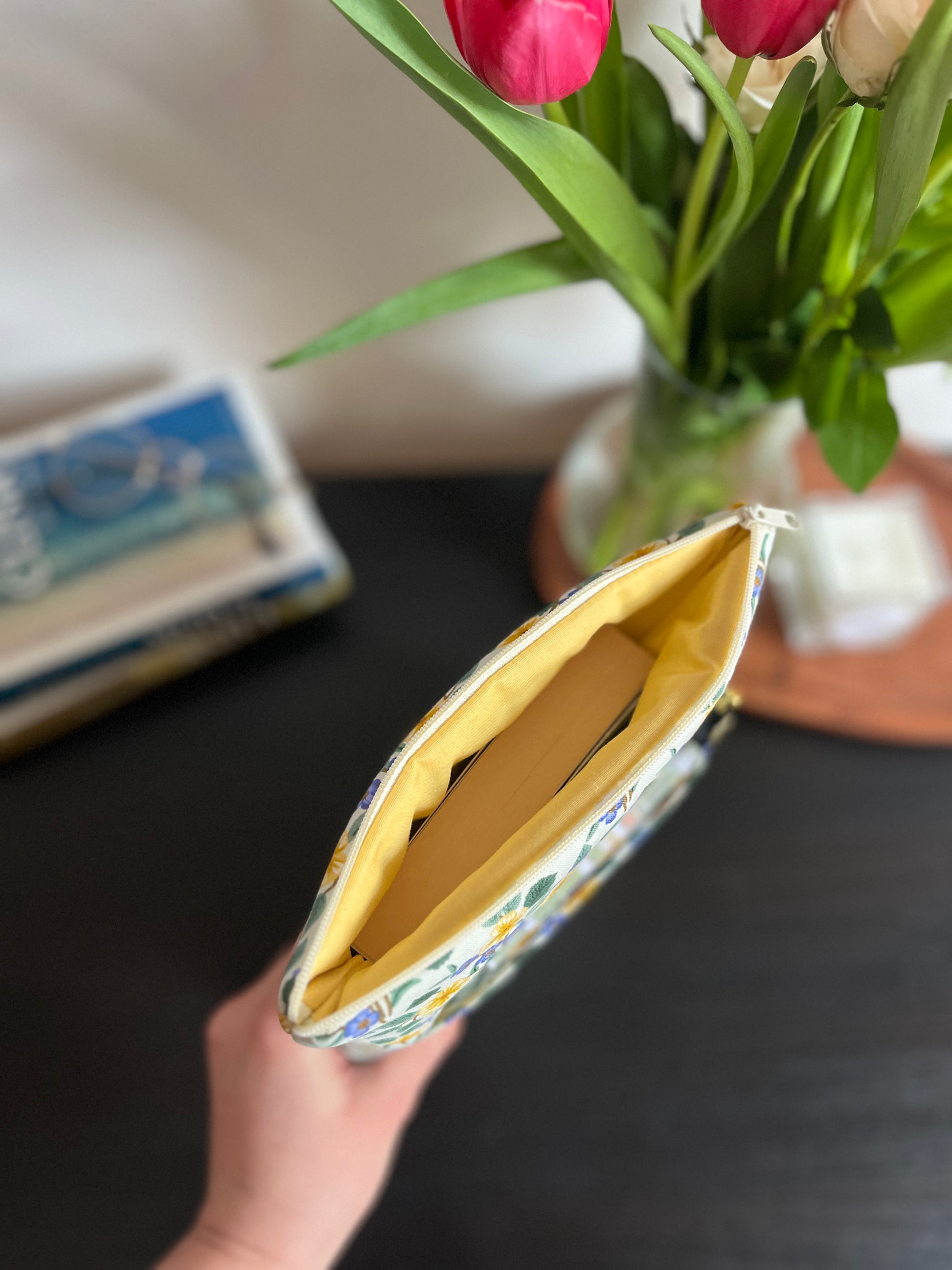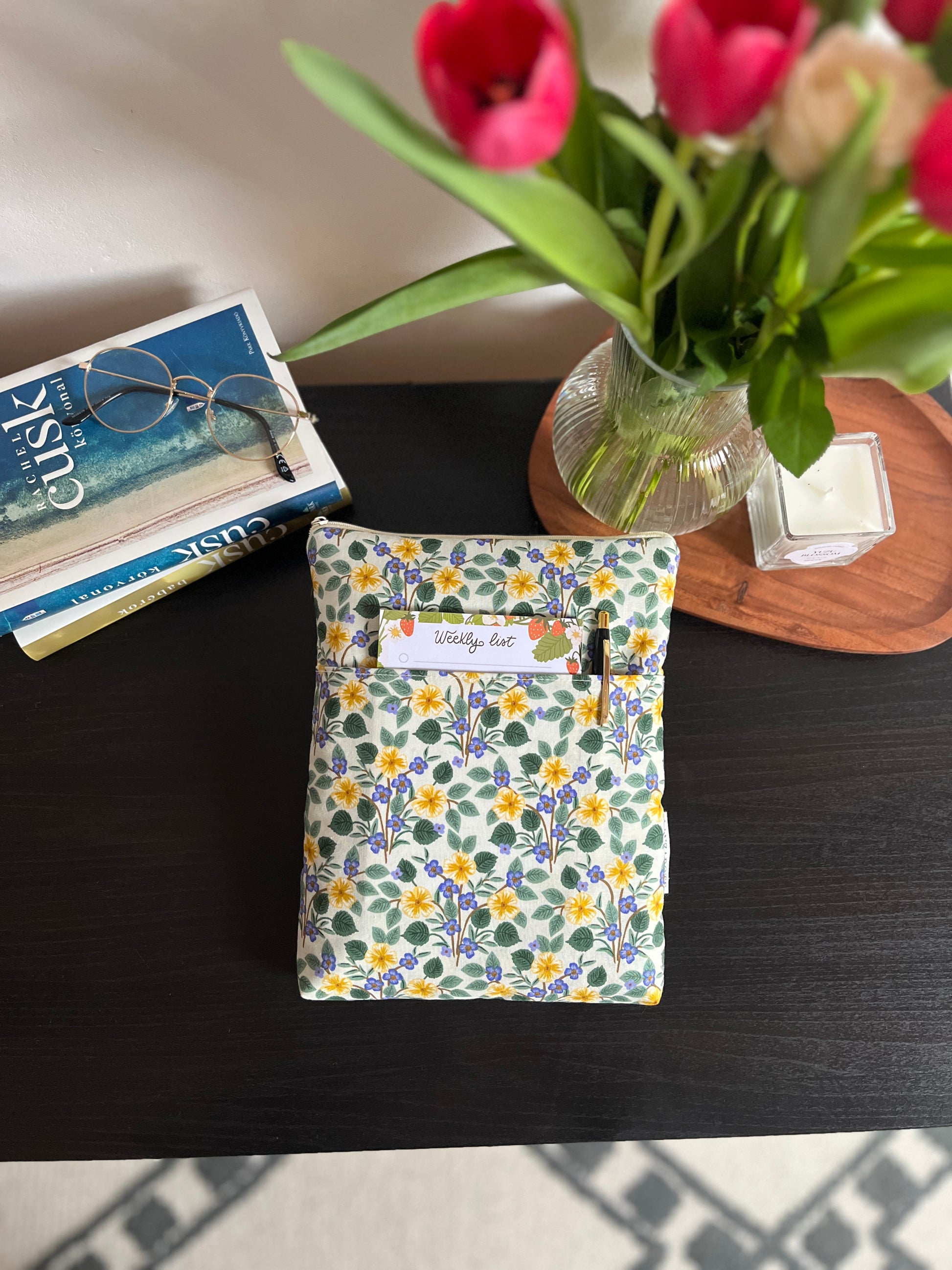 Cipzárral záródó könyvtok, zsebbel az elején.