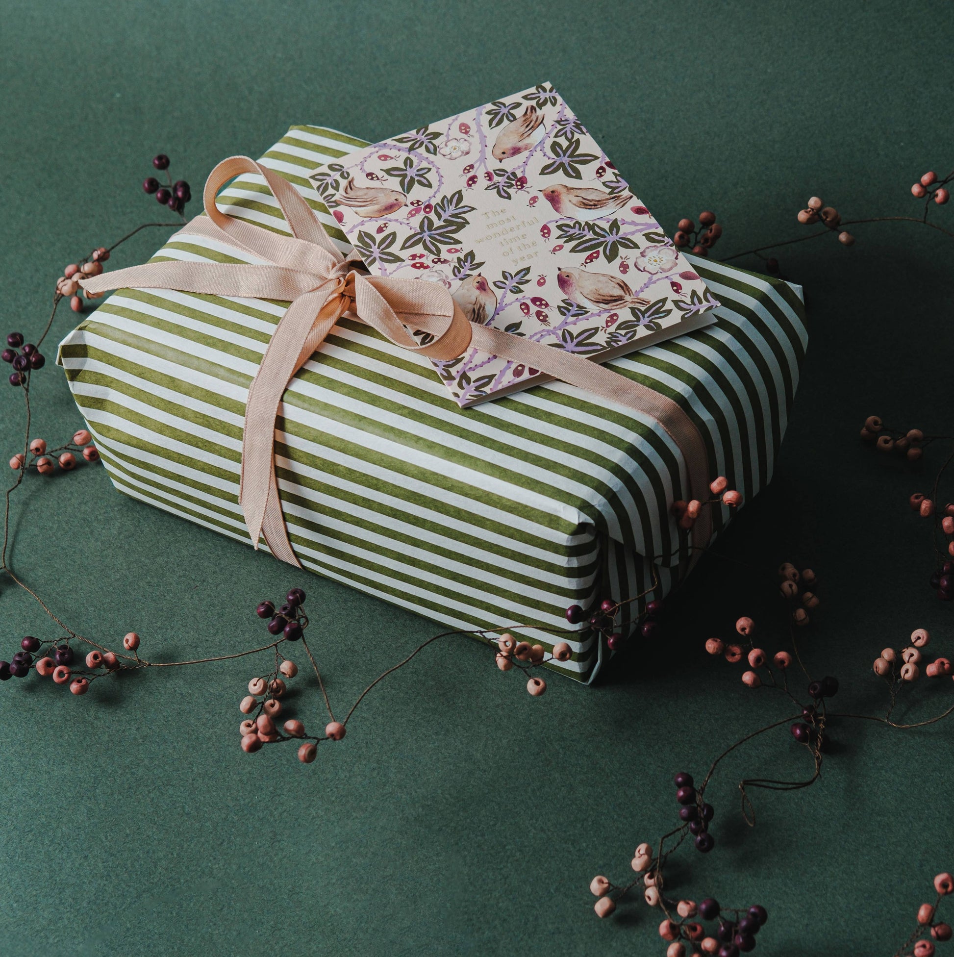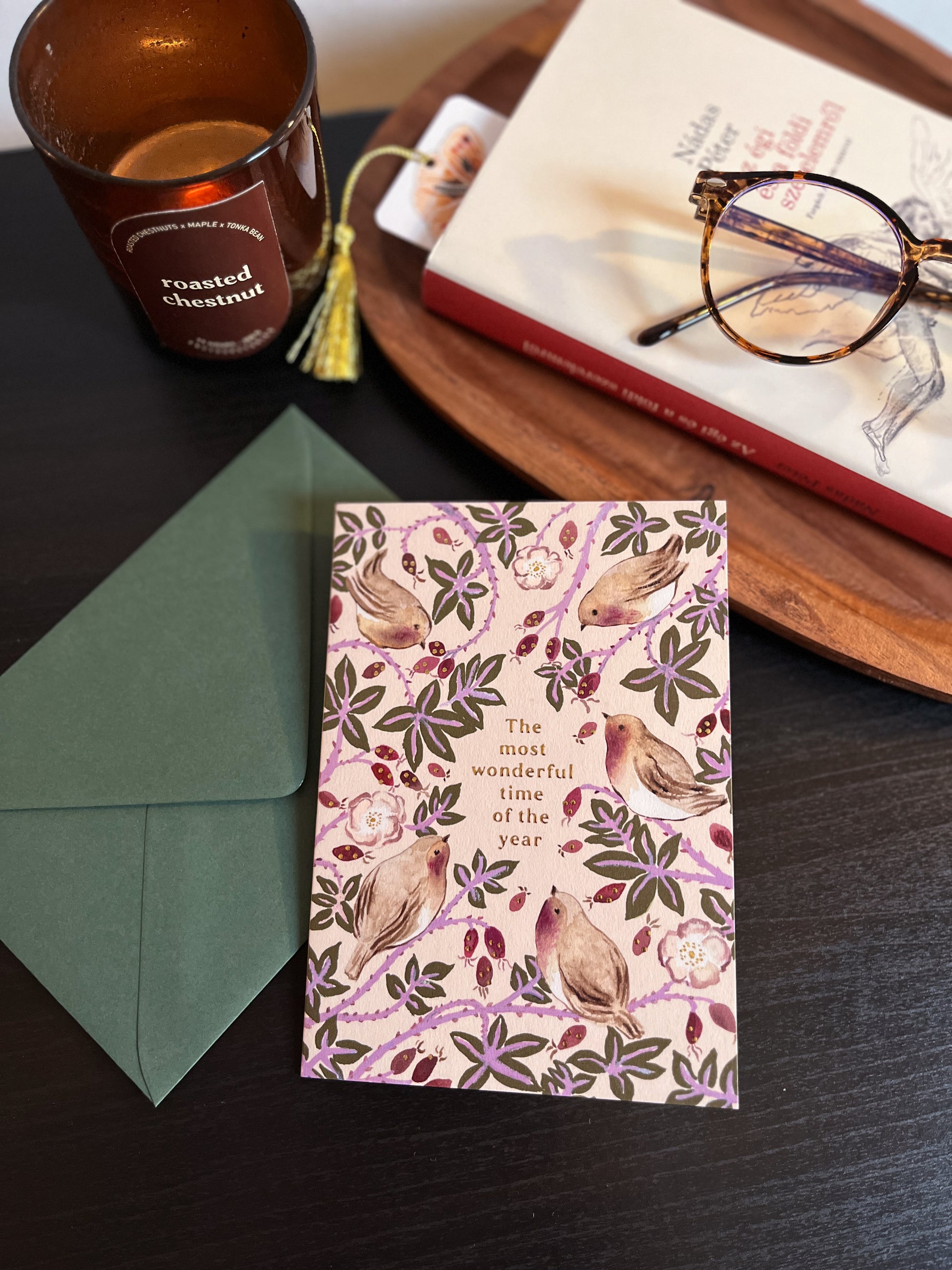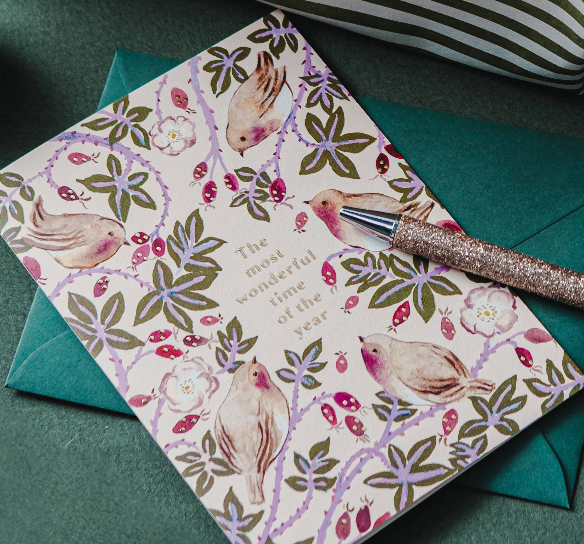 Prémium minőségű képeslap csipkebogyó és veréb mintával, "The most wonderful time of the year" felirattal, aranyszínű díszítésekkel. Hozzá illő sötétzöld borítékkal.