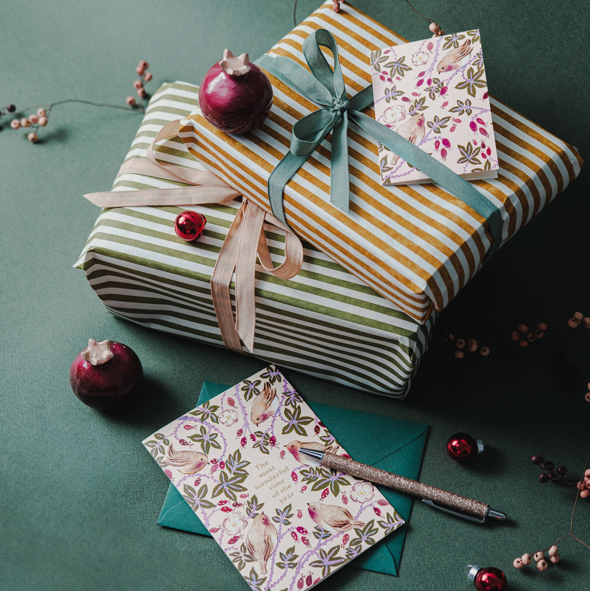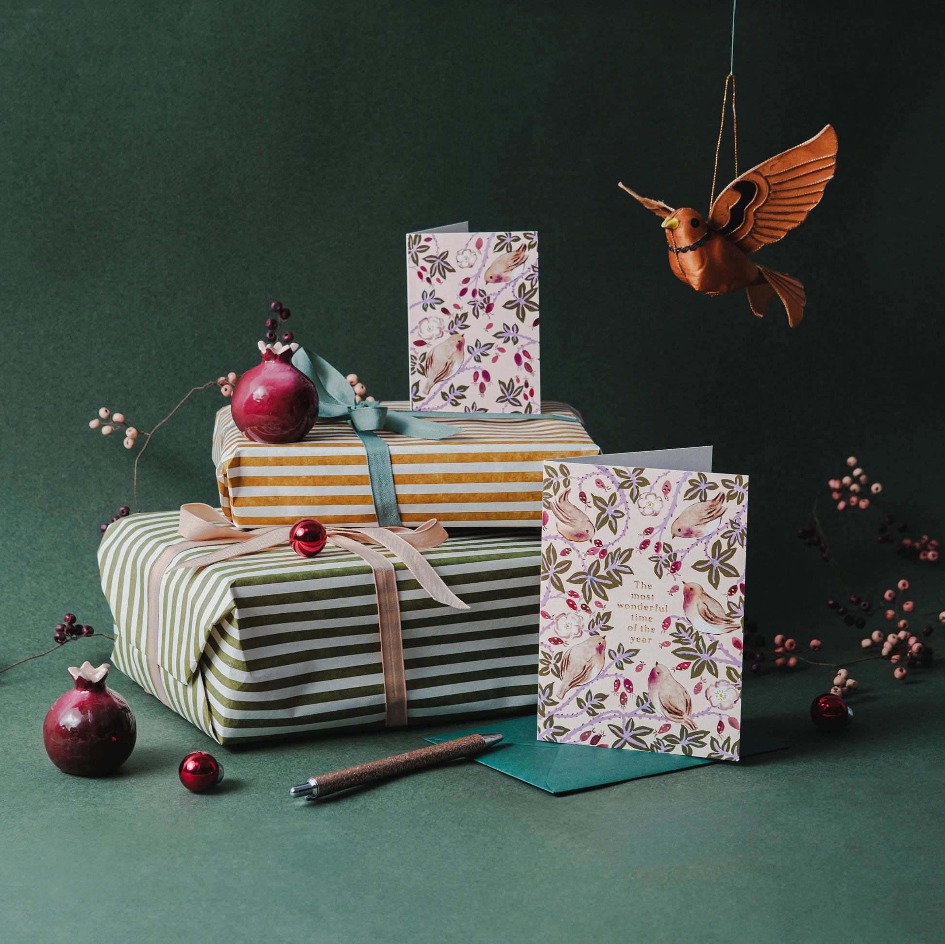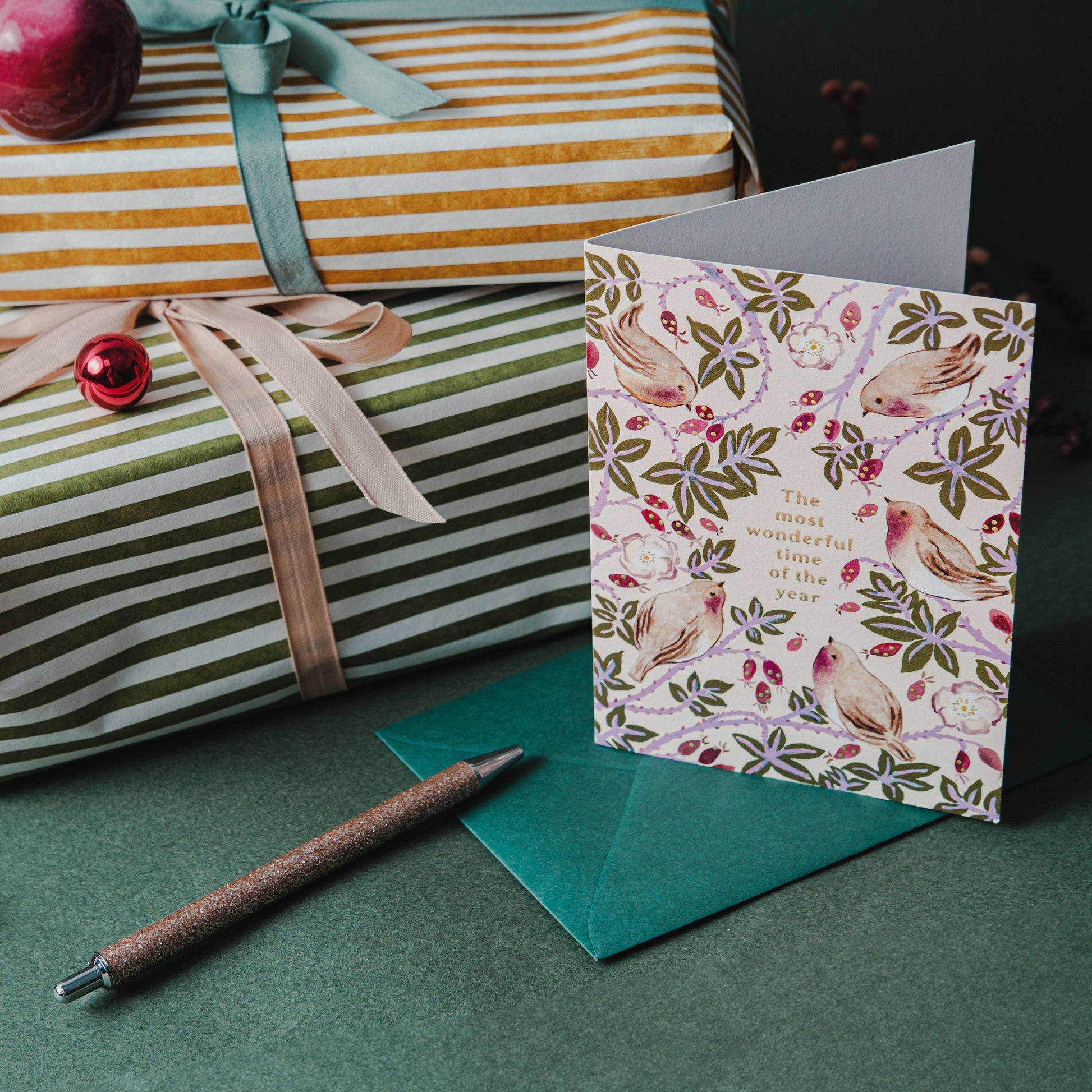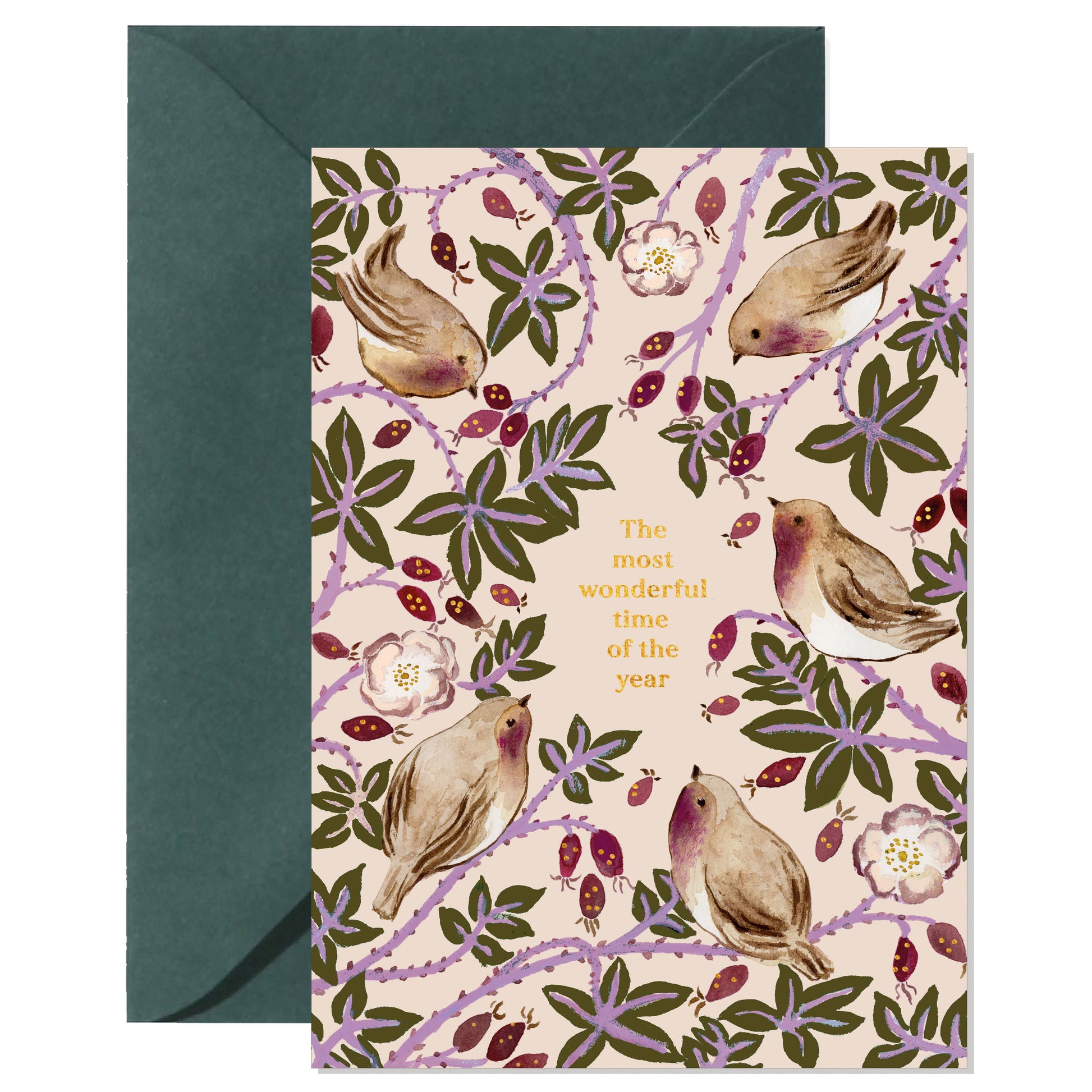 Luxury greeting card with a colorful illustration of robins and rose hips and the text 'The most wonderful time of the year' and gold foil details. Printed on FSC-certified paper. With a matching dark green envelope. Packaged in a cellophane bag. Card dimensions: 105x148 mm Envelope dimensions: 110x156 mm