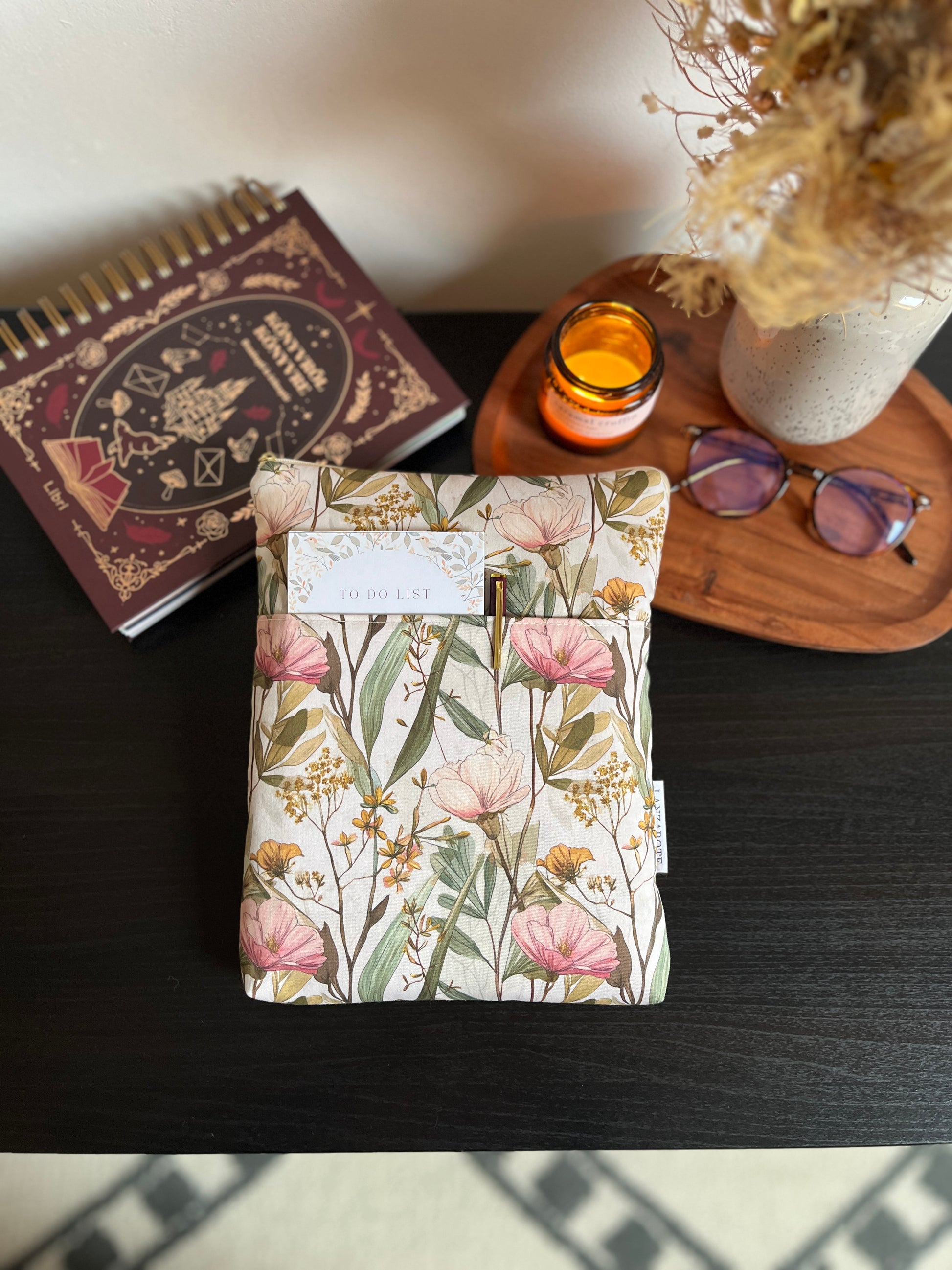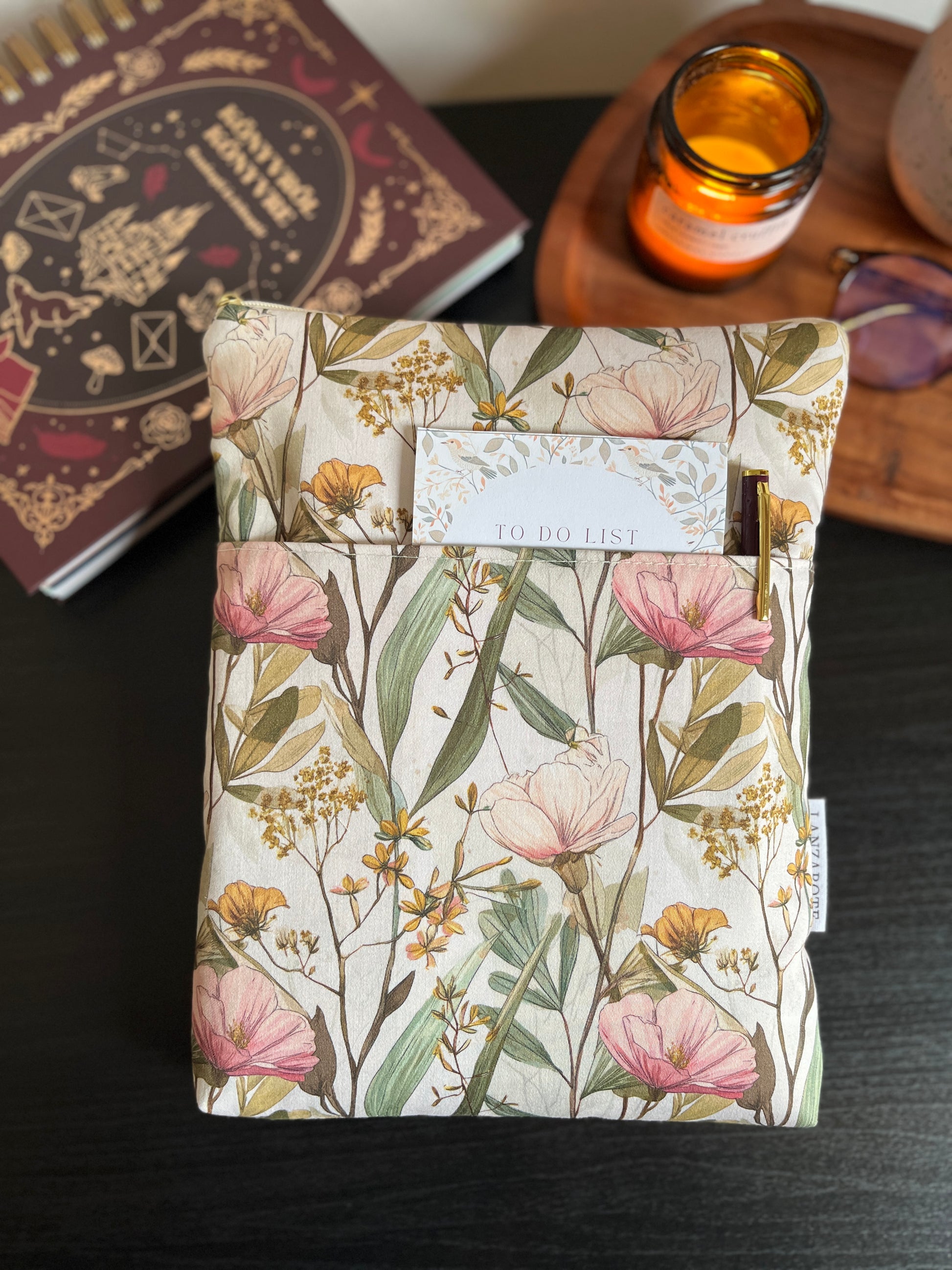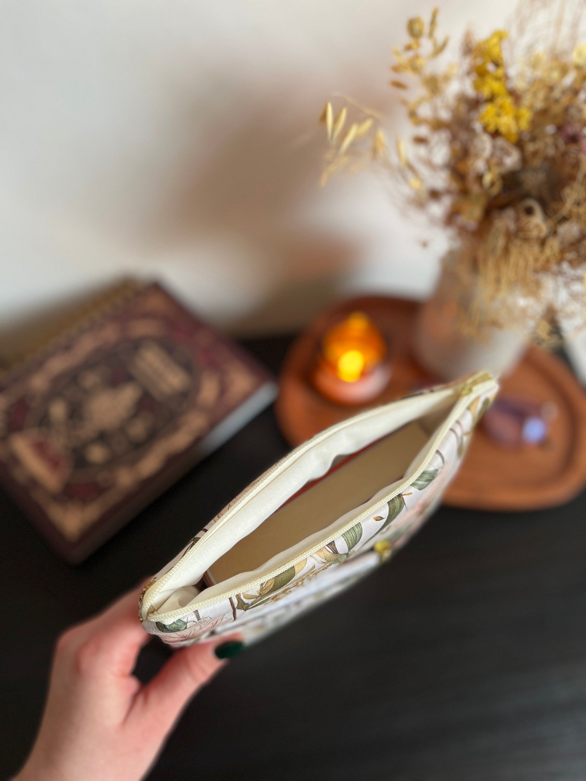 Cipzárral záródó könyvtok, zsebbel az elején.
