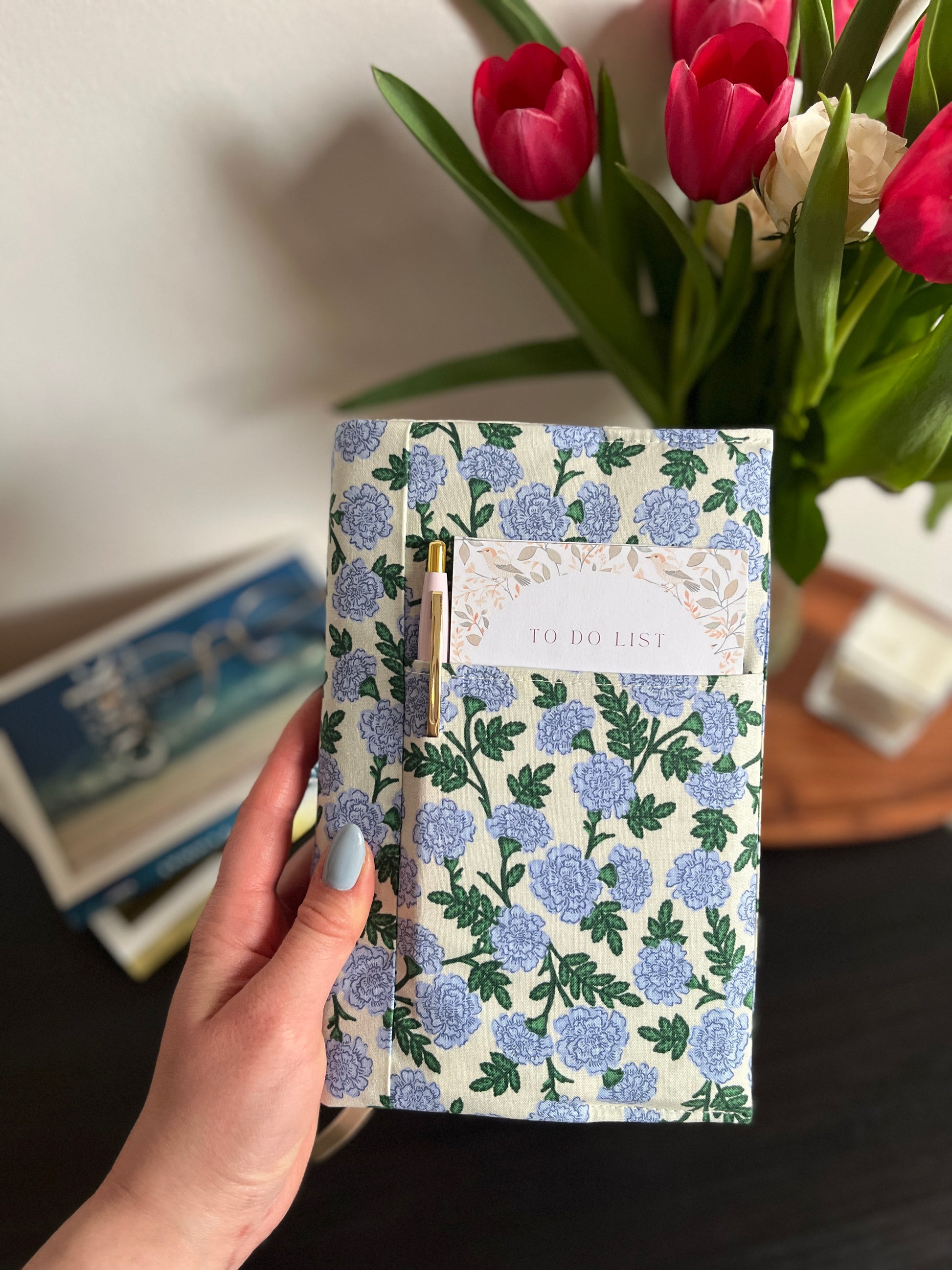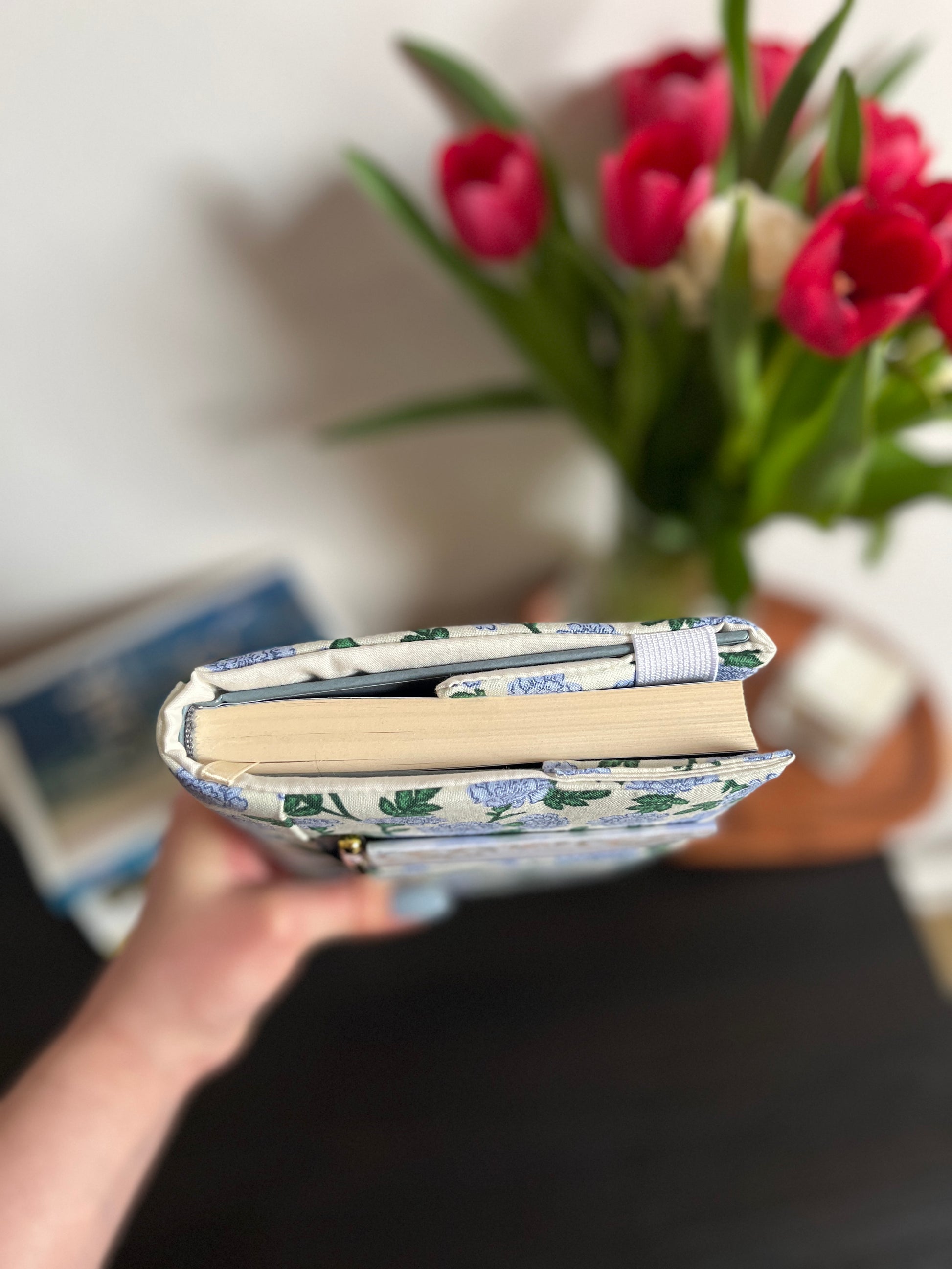 Kis és közepes méretű textil védőborító, puha közbéléssel, könyvjelzővel.