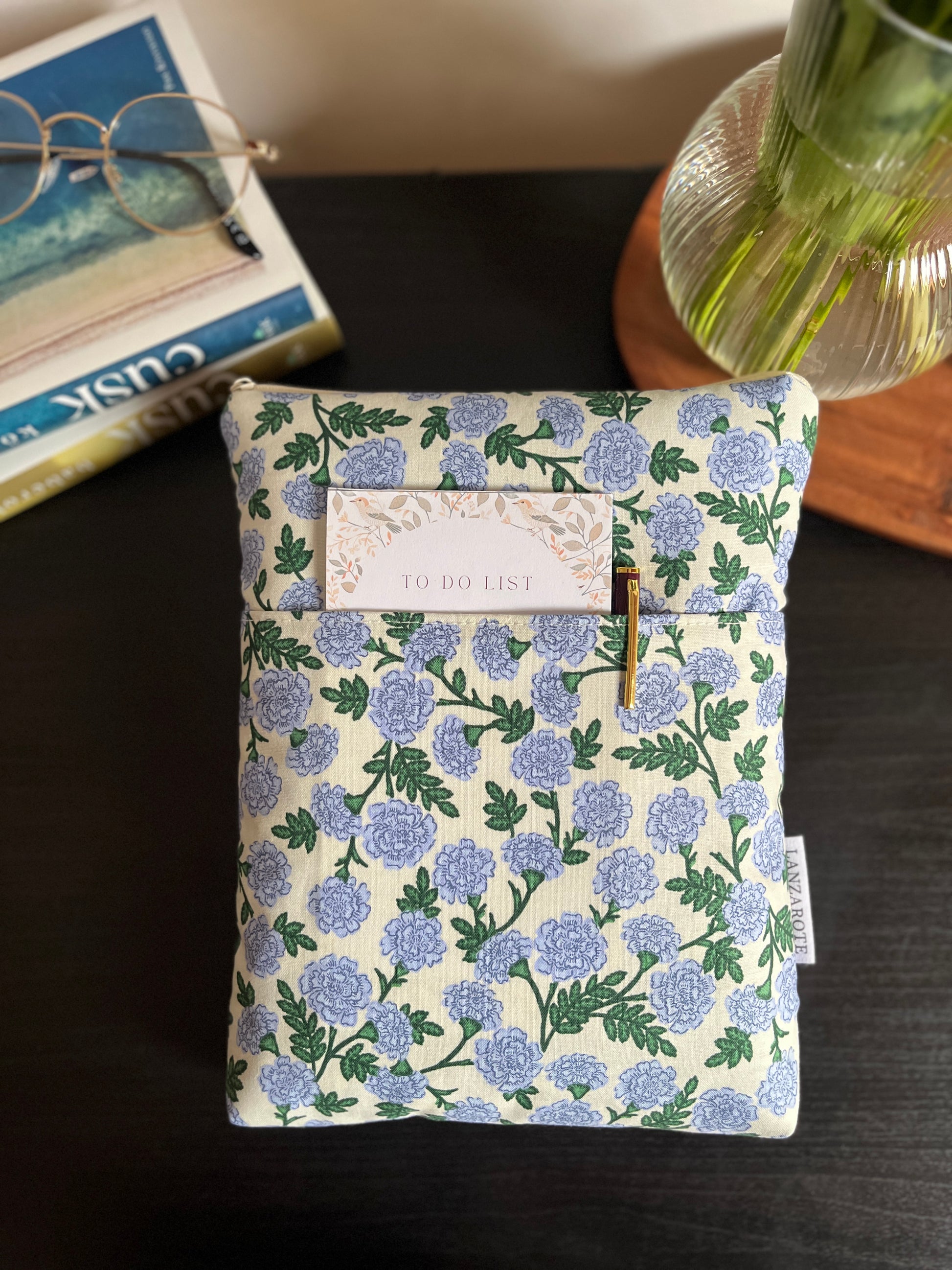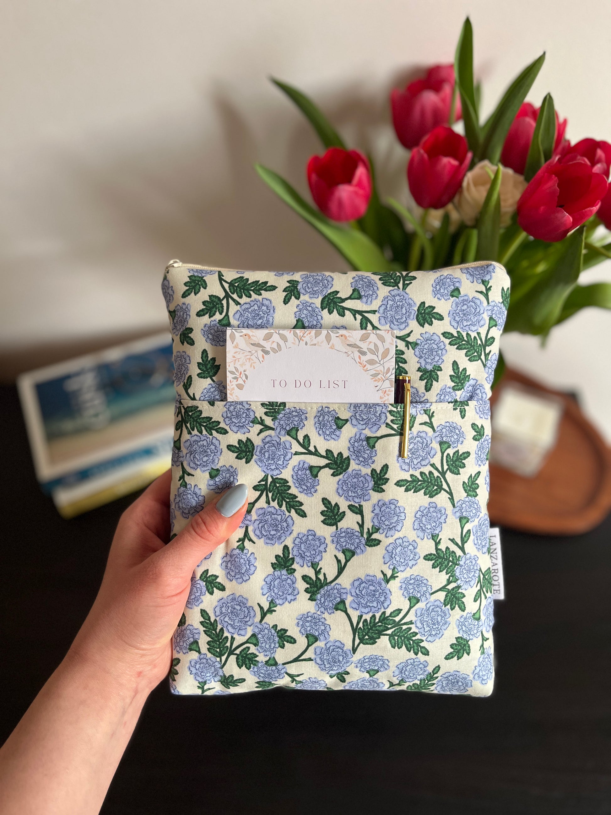 Cipzárral záródó könyvtok, zsebbel az elején.