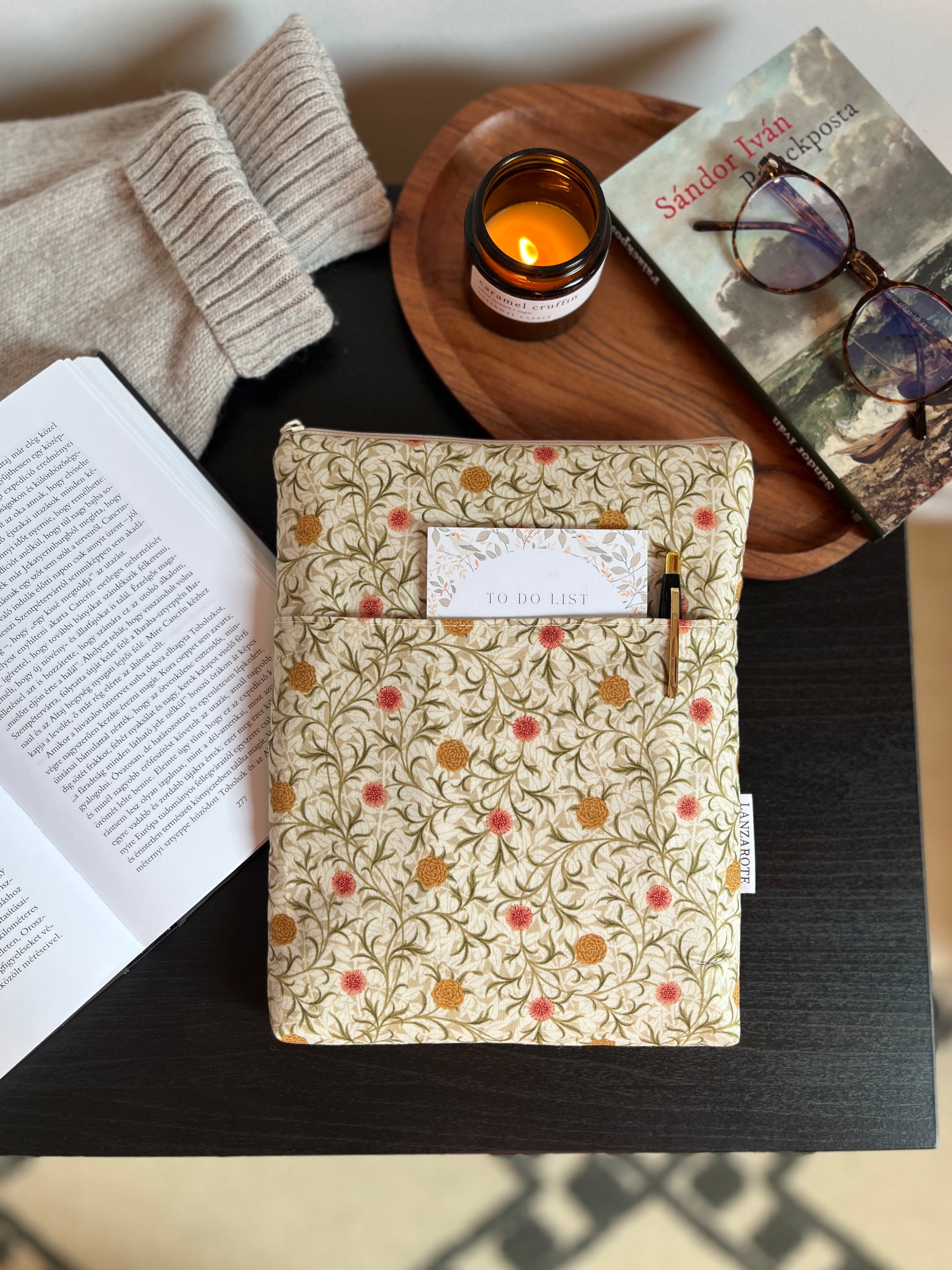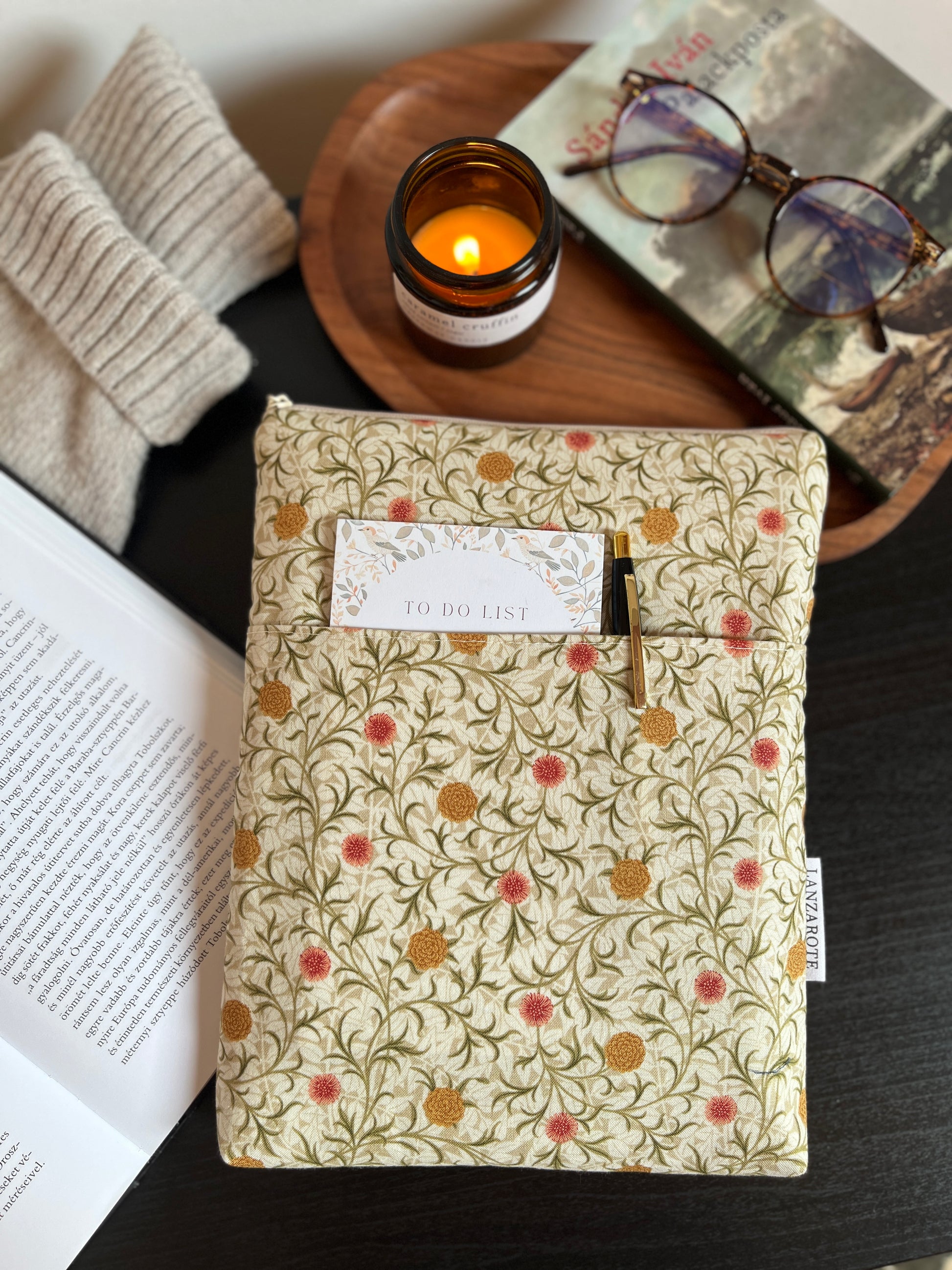 Cipzárral záródó könyvtok, zsebbel az elején.